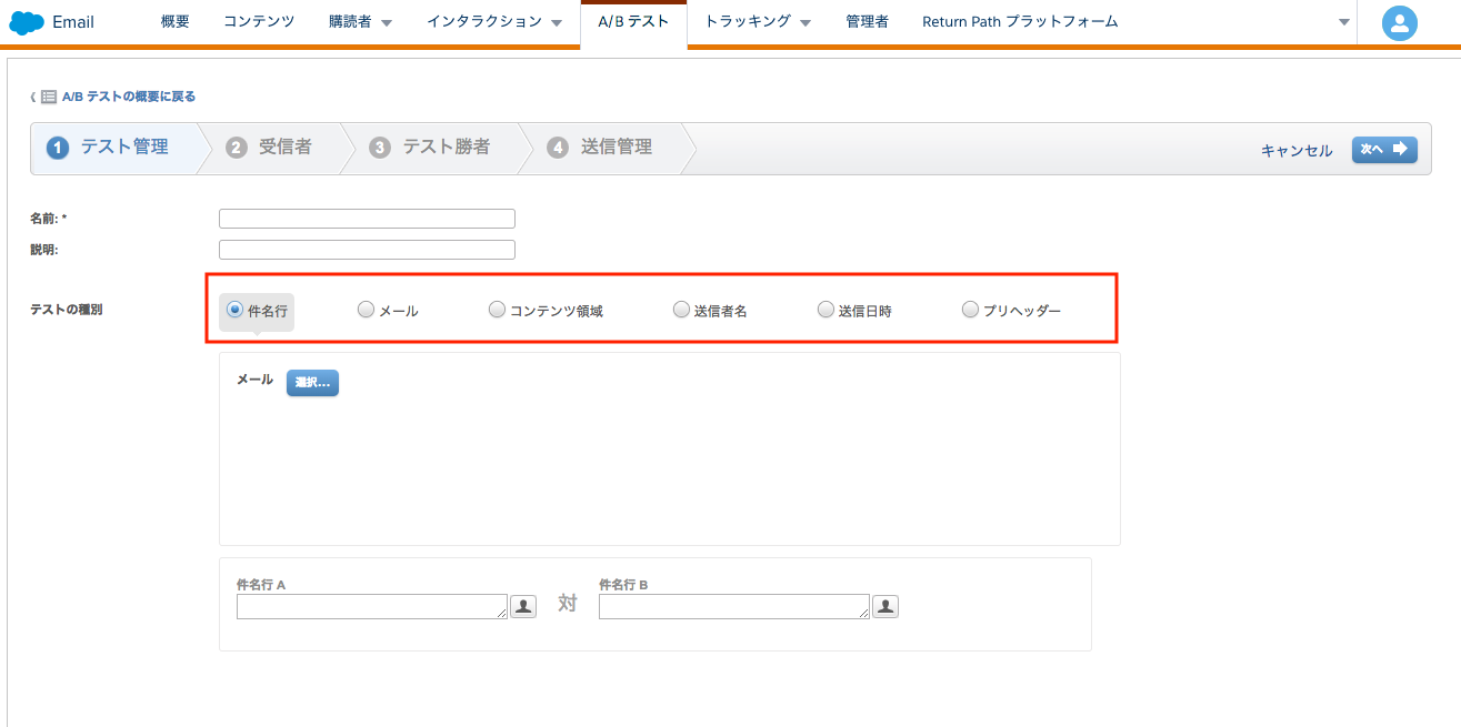 - メニューからEmail Studio > Email から上部にあるA/Bテストへアクセス