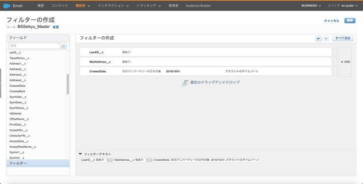 - 左のフィールドからフィルターに必要な条件をドラッグ&ドロップし右上の[保存]をクリックしデータフィルター名などプロパティ設定をして[保存]