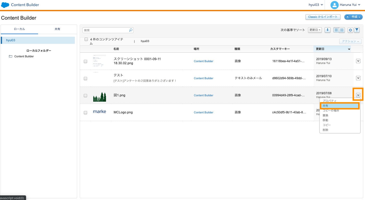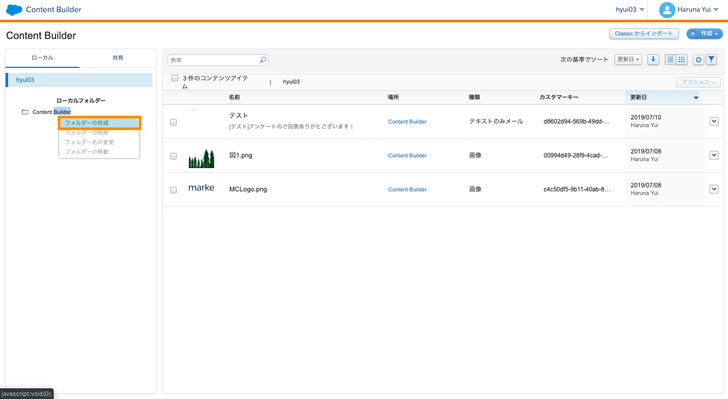 - 左のメニューのContent Builderフォルダを右クリックでフォルダーを作成