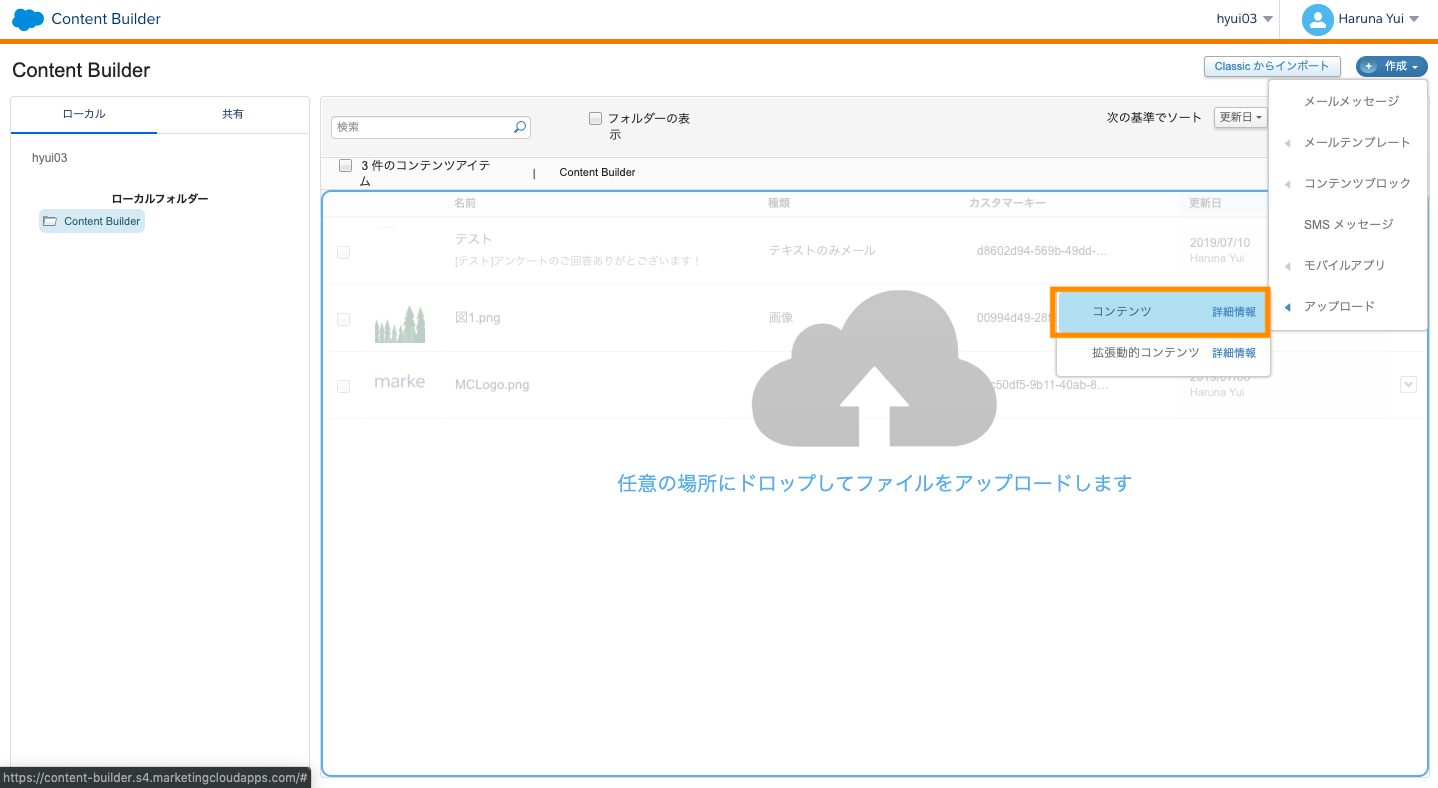 - 1で作成したフォルダを選択し、右上[+作成]>アップロード>コンテンツにて画像やロゴなどのコンテンツをローカルから選択
