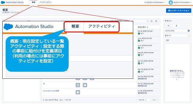 - 概要タブ:設定済みのオートメーション一覧が管理される。各処理を定義したアクティビティを組み合わせて一連の処理を自動化するオートメーションを作成する