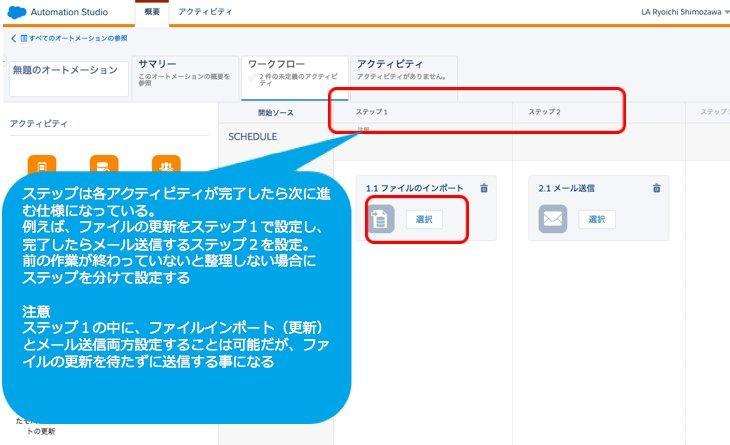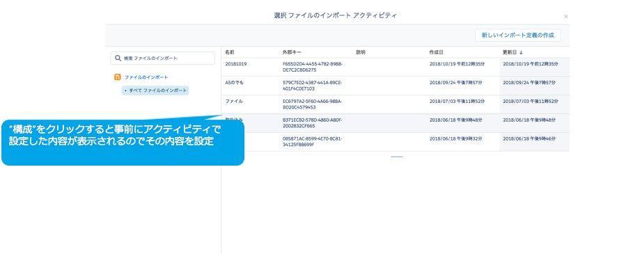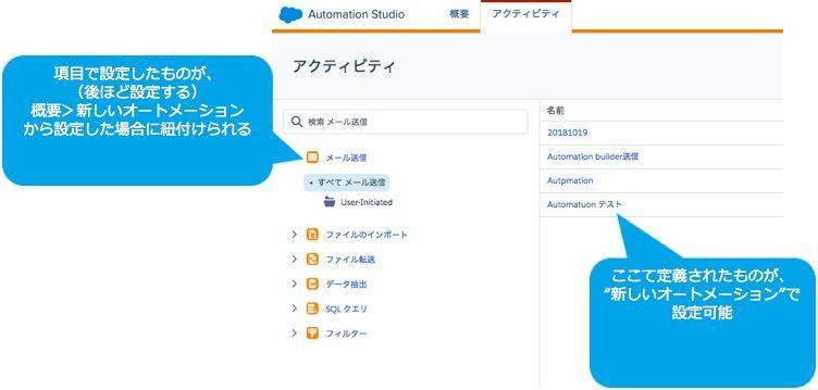 https://help.salesforce.com/articleView?id=mc_as_send_email_activity.htm&type=5&language=ja - ファイルのインポート:どのデータエクステンションにどんなファイルをインポートするか設定