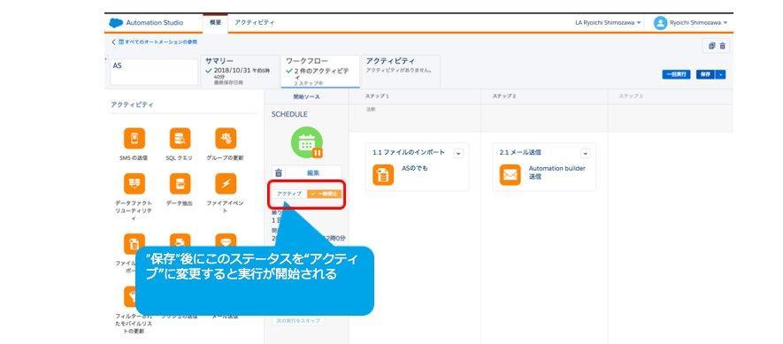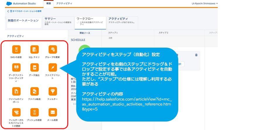 - アクティビティタブ:作成済みのアクティビティ一覧が管理される。インポートやメッセージ配信などの各処理をアクティビティとして各々定義する