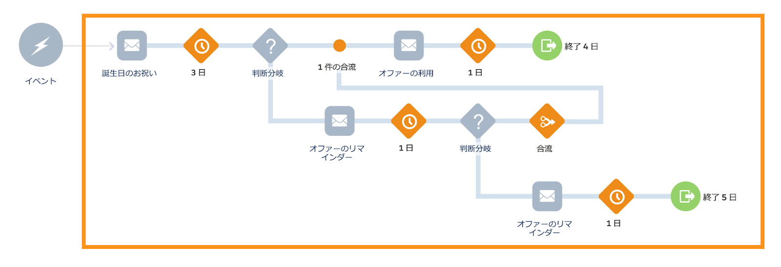 以下オレンジ枠のようなジャーニーのフローを指します。各アクティビティをキャンバスにドラッグ&ドロップすることでフローを作成します。