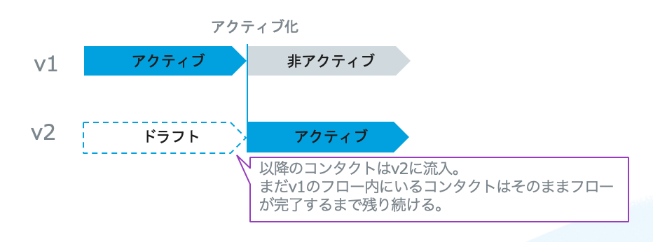 - 終了中:非アクティブなバージョン。以前のアクティブなバージョン。最後のコンタクトがジャーニーを最後まで終了させると非アクティブなバージョンとなる