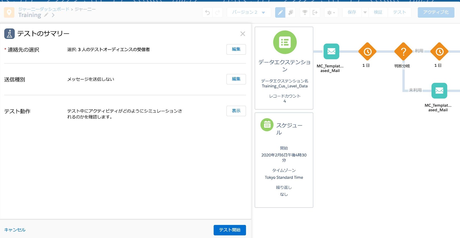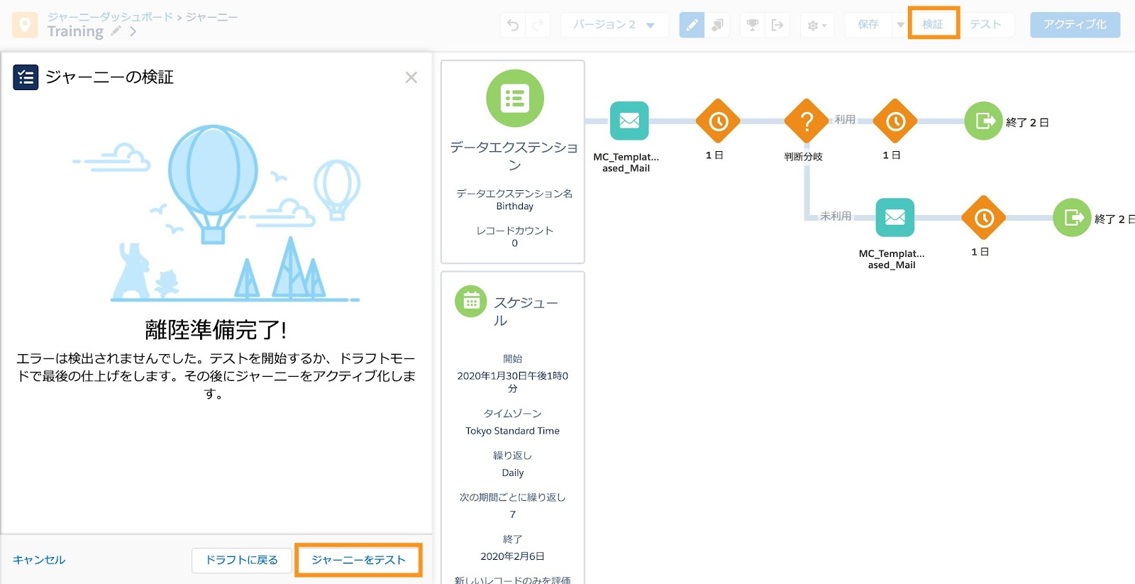 - Journey Builderの設定が完了したら右上の[検証]をクリック