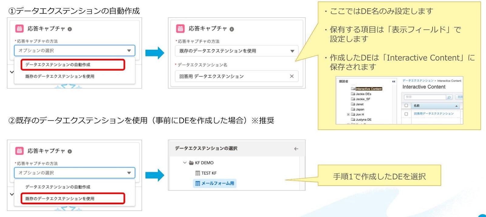 ①「データエクステンションの自動作成」と②「既存のデータエクステンションを使用」が選択可能