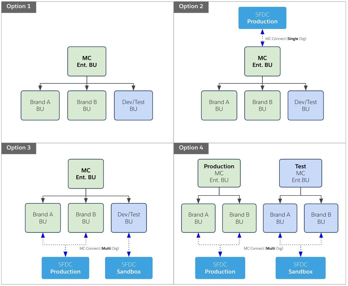 メール、SMS、モバイルアプリ、ウェブ (LP) という具合に、それぞれの担当が個別に BU を持った場合、連絡先キーが一致しないことよるコンタクト数の超過、Journey でのマルチチャンネル配信不可、エンドカスタマーは別々のチャネルから近似のメッセージを受け取る (コミュニケーションの分断)、といった弊害が予想される。
