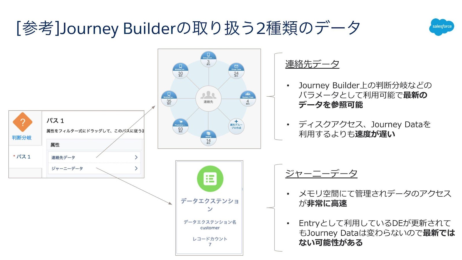 - 常に最新情報を扱える「連絡先データ」と、高速な「ジャーニーデータ」の2種類がある