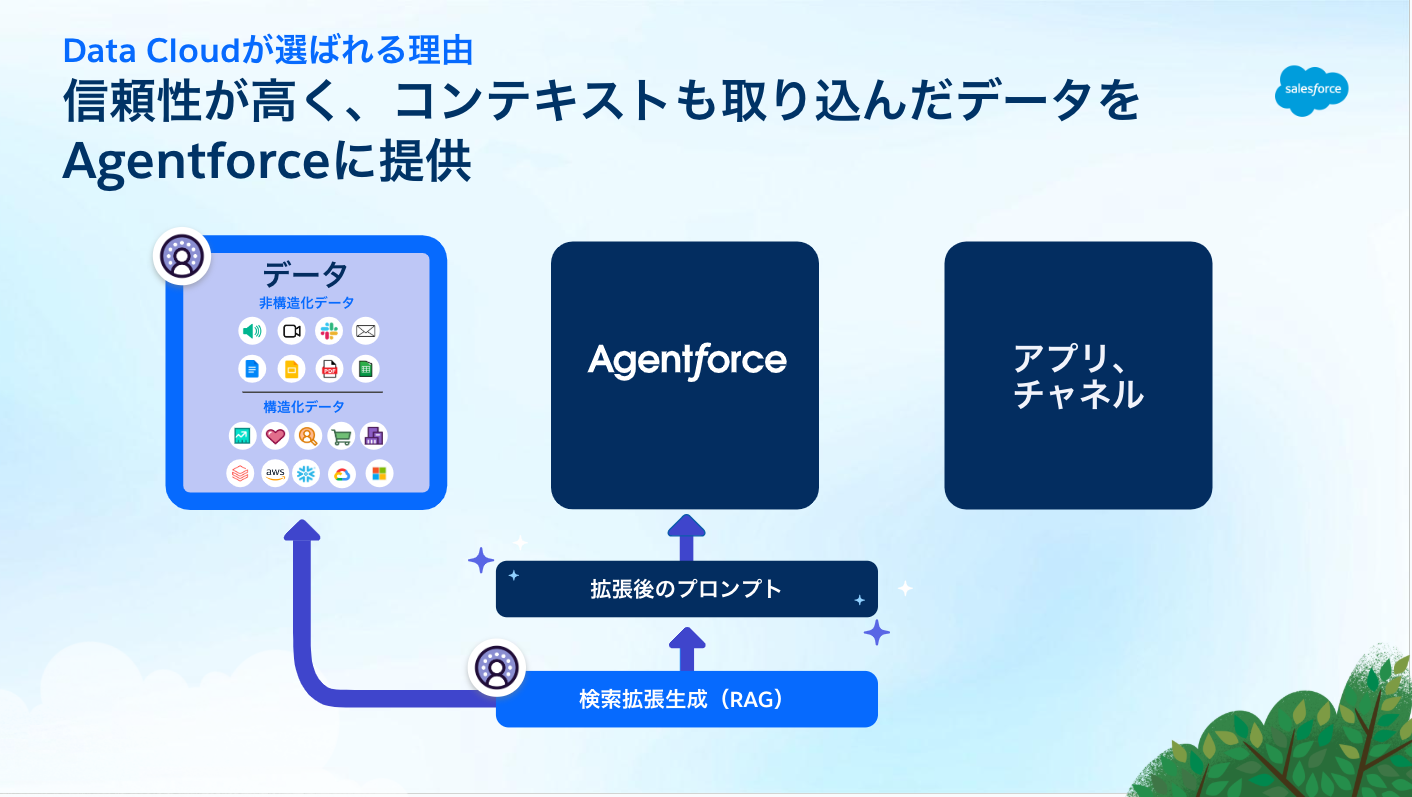 Data 360 は、 RAG の文脈では特に非構造化データの蓄積基盤として機能します。 PDF ドキュメントや通話録音の文字起こし、メール、画像ファイルなどの非構造化データを処理し、 AI が検索可能な形で蓄積できます。つまり、 Data 360 上に企業のナレッジ記事や製品マニュアル、メール履歴などを取り込むことで、それらが RAG で活用できるデータとなり、意味検索(セマンティック検索)が可能になります。こうして準備されたデータ基盤に対し、自律型AI機能である Agentforce がユーザからの質問をもとに検索をかけ、関連性の高い情報をプロンプトに組み込むことで回答の精度と信頼性を高めることができます。
