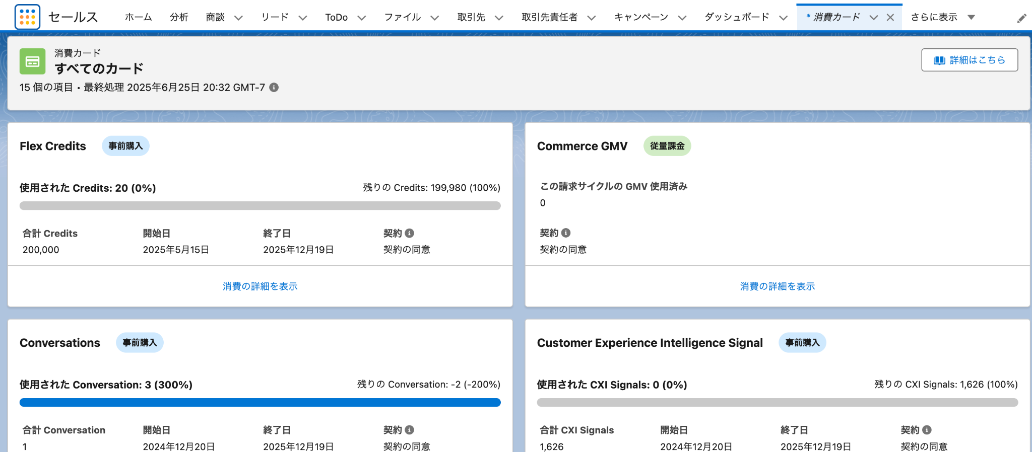 - ライセンスが Agentforce Flex Credits、または Salesforce Foundations Entitlements Flex Credits の場合の確認すべき消費カード:
