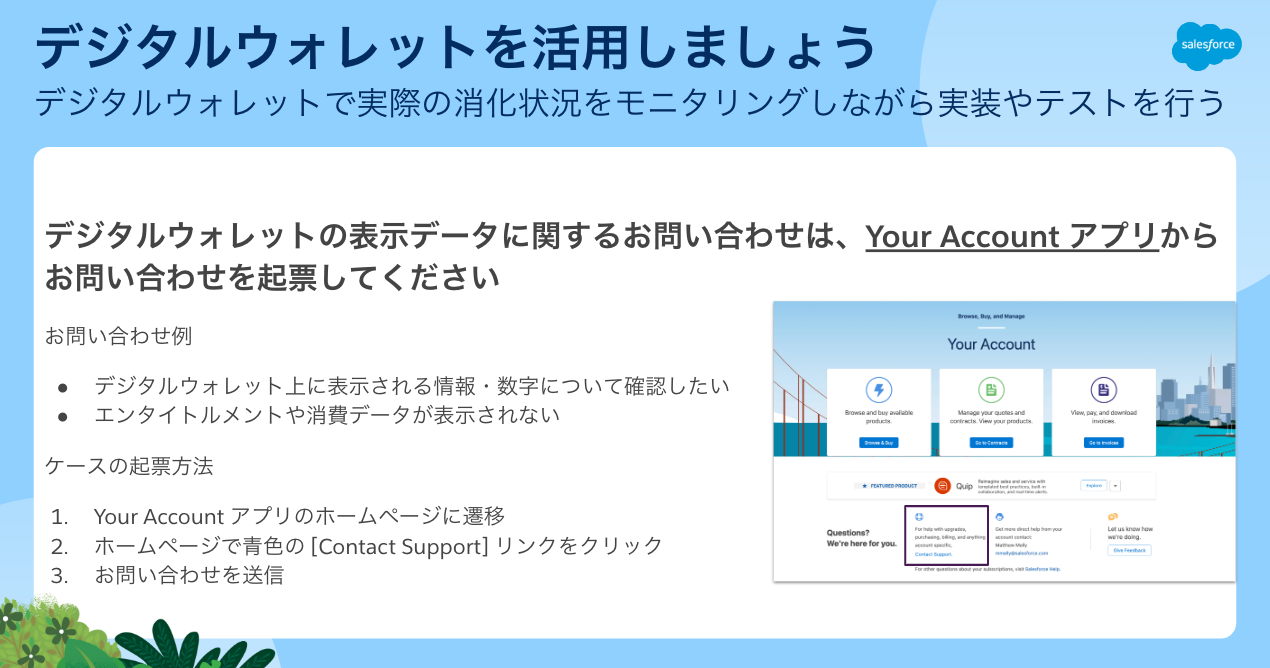 ※デジタルウォレットの動作不備、画面不具合などの技術的な問題、および Data 360 全般のお問い合わせは Salesforce ヘルプからお問い合わせを起票してください。