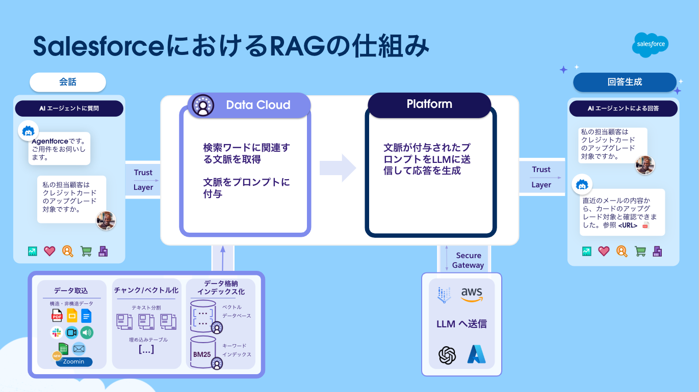 - Salesforce プラットフォーム上で RAG がどのように実現されているか、 Data Cloud と Agentforce の役割分担