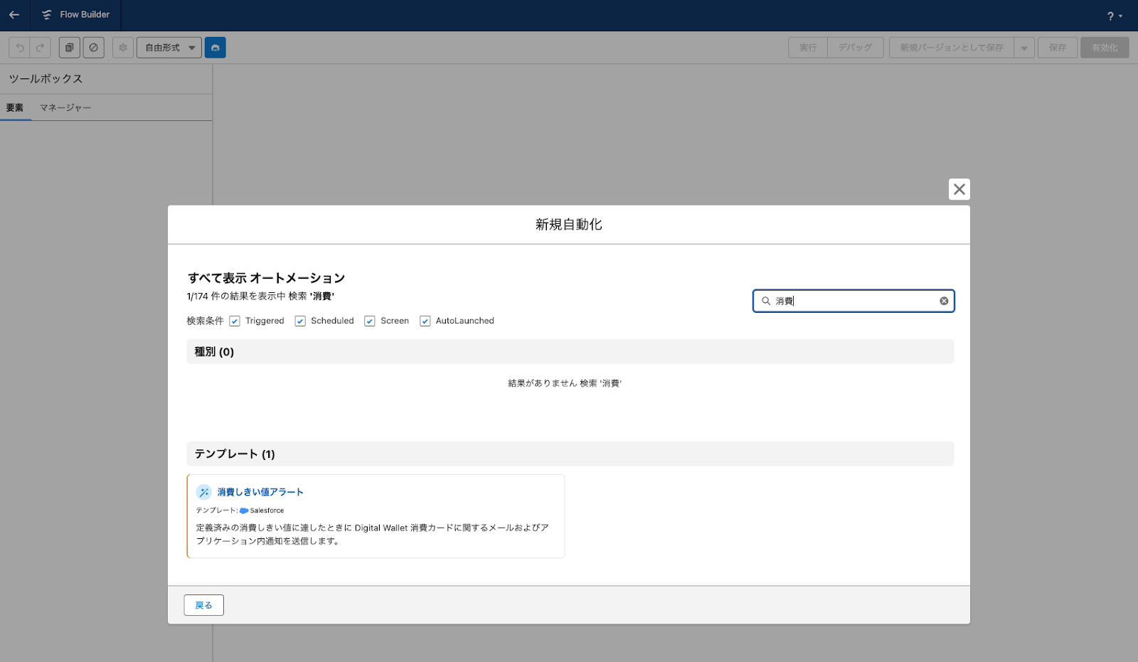 [設定] >[フロー]>[新規フロー]>[ Consumption Threshold Alerts (消費しきい値アラート)] フローを検索して選択し、[作成] をクリックし、アラートフローを作成します。