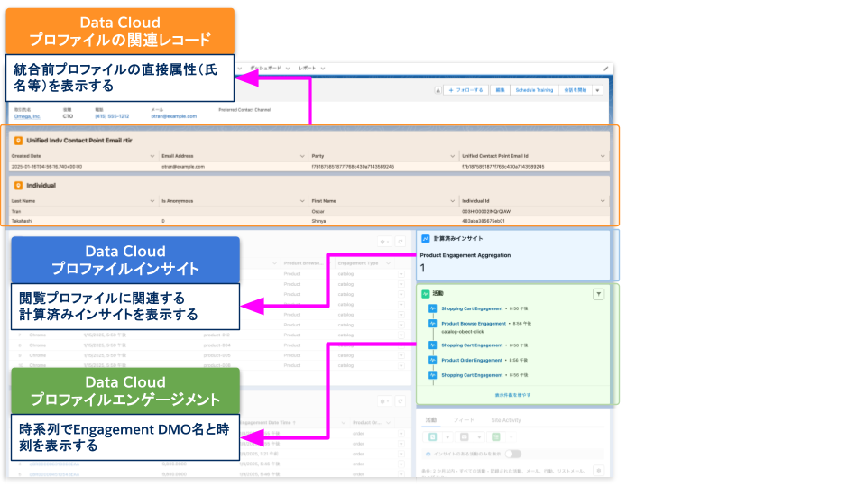 上記の図でいうと、LTV の部分は Data Cloud で算出した CIO の特定の項目が Salesforce のレコード画面で見えています。