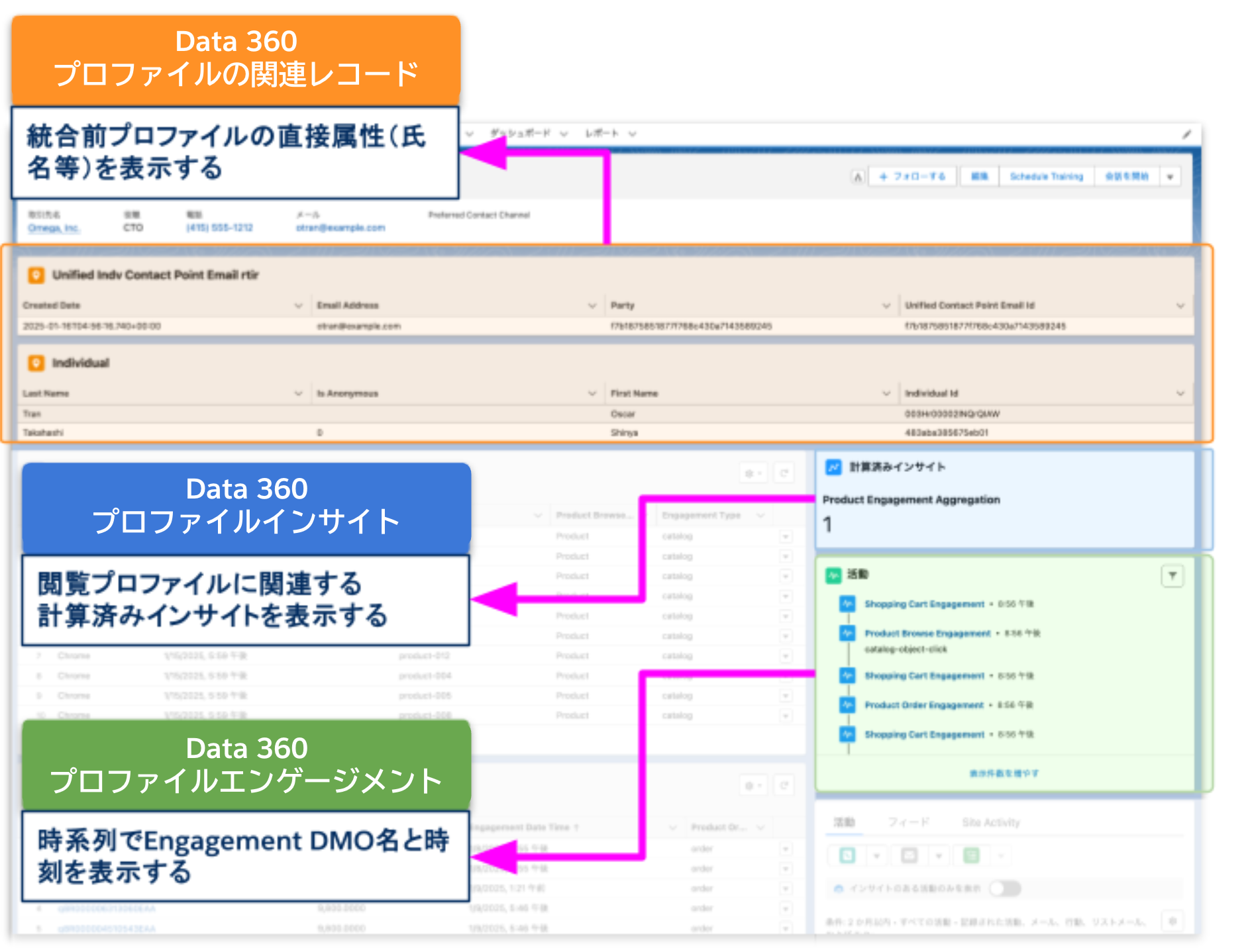 Data 360 で統合された顧客データやインサイトは CRM の画面上で活用することができます。