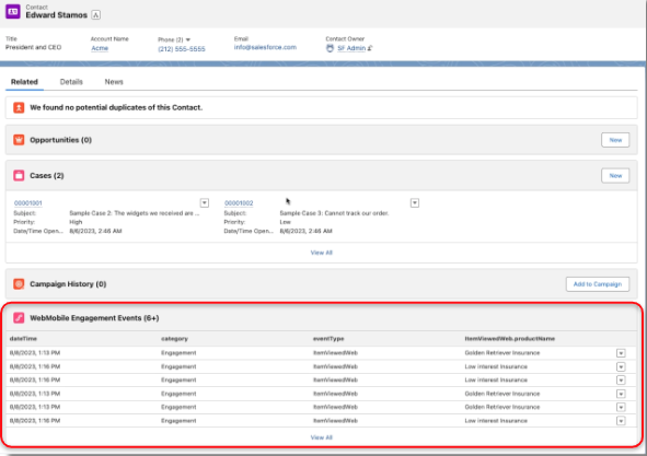 エンリッチメント関連リストに表示されるデータはほぼリアルタイムで更新されるため、最新の顧客エンゲージメントを把握することができます。
