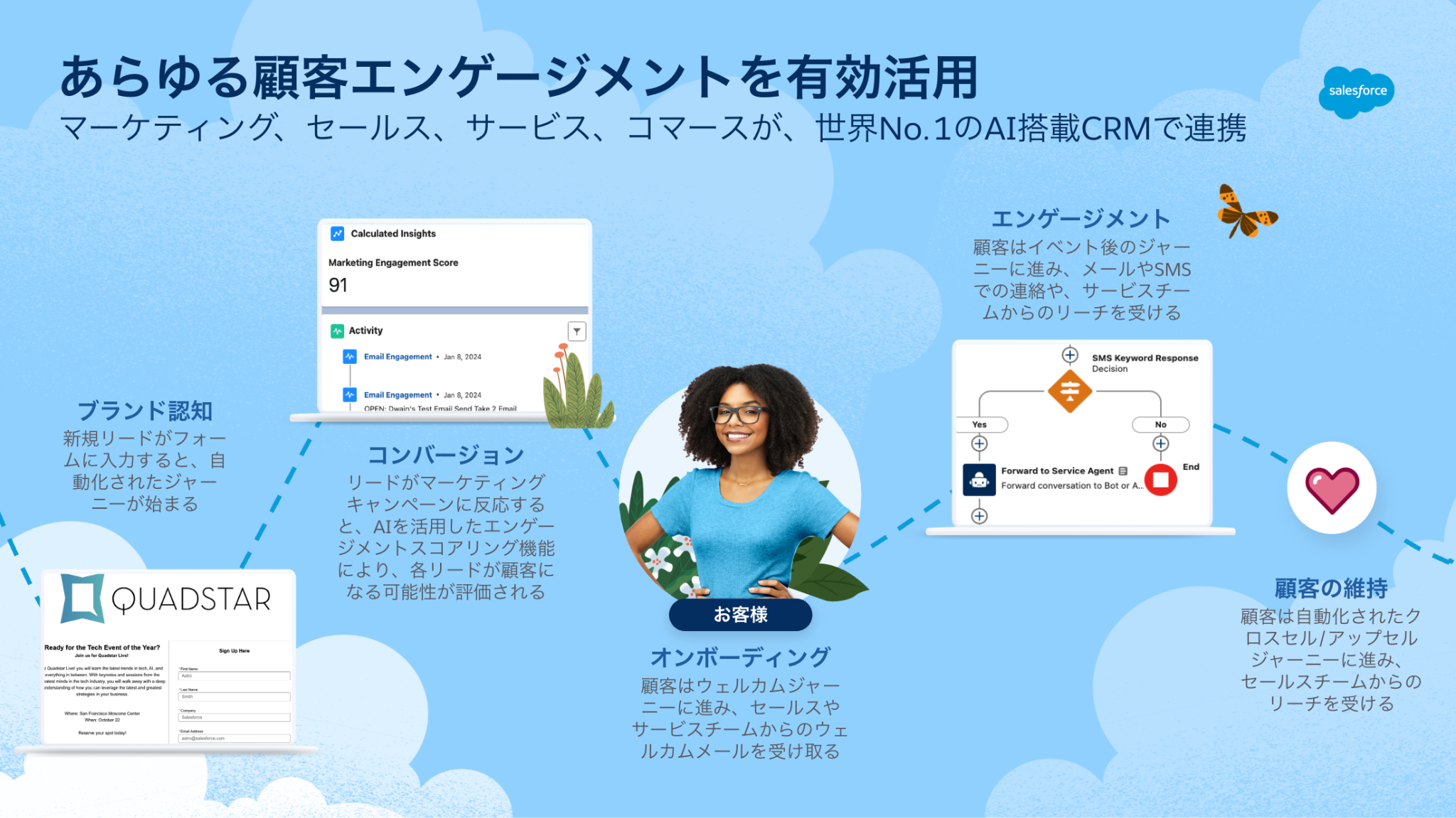 - マーケティング、セールス、サービス、コマース間のシームレスなハンドオフにより、部門を超えたコネクテッドジャーニーを構築します。