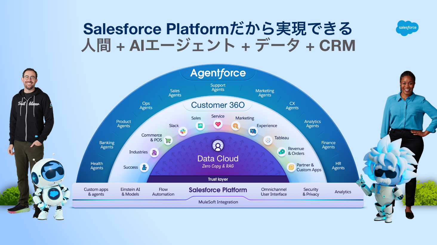- Marketing Cloudは、プラットフォームの機能をチームのマーケティング活動に組み込みます。Data Cloudを使用して複数のデータソースを統合し、Experience Cloudを使用してコンテンツを作成し、Flow Builderを使用して複雑なカスタマージャーニーを強化し、同過程でEinsteinを使用して最適化できます。