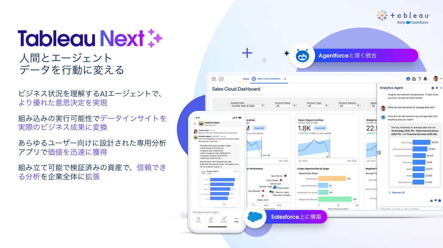 Tableau Next はAgentforceとネイティブに統合されており、Tableau Next専用の分析AI エージェントを作成・活用することができます。
