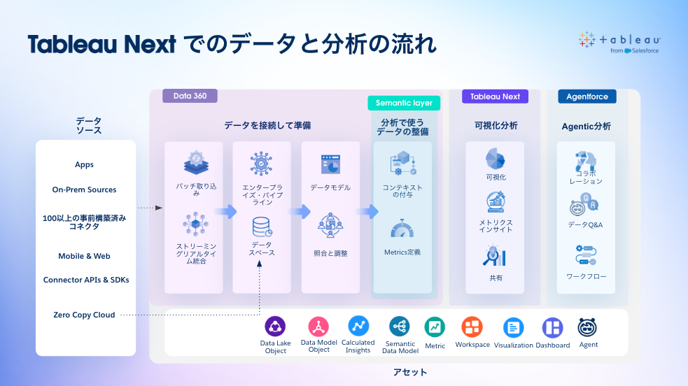 Tableau Next は、Salesforce プラットフォーム上で動作し、Agentforce (AIエージェント) と統合された次世代の分析ツールです。