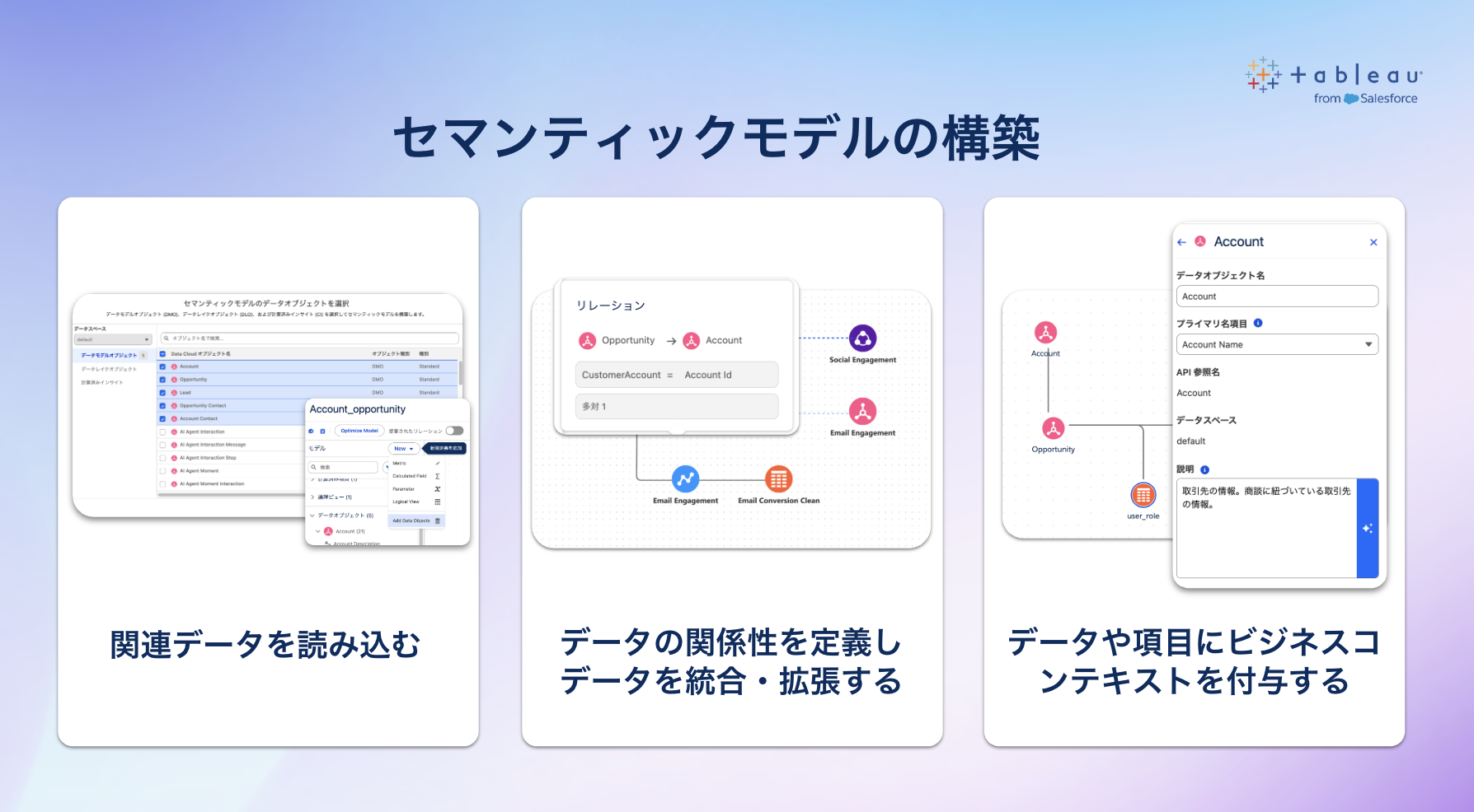 「Data 360」(旧Data Cloud)を基盤として、顧客データ、販売データ、Webログなど、散らばったデータを一元管理し、エンタープライズクラスのセキュリティとコンプライアンスを守りながら、顧客データを分析できます。 - ビジネス文脈を反映した柔軟なデータモデルの構築