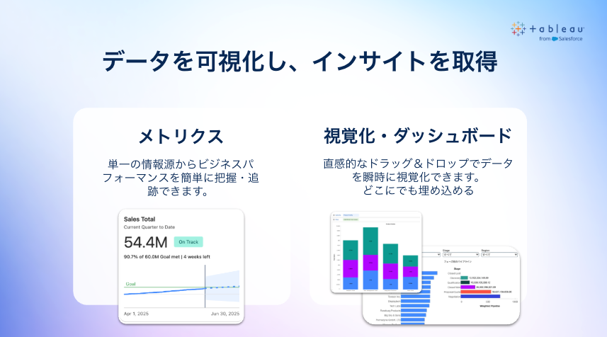Tableau Next は既存のTableau を置き換えるものではなく、並行して提供される別プロダクトです。従来の Tableau の強みである「データの可視化力」を受け継ぎつつ、企業データの統合・AI との協働・業務文脈への組み込みをさらに強化した点が大きな特徴です。