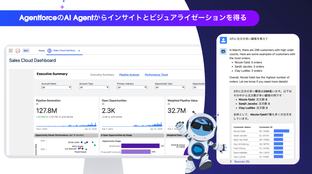 Agentforce とネイティブに統合されているため、分析AIエージェントが、データの理解やインサイト分析をサポートします。自然言語でエージェントと対話しながら、素早くインサイトを取得し、ビジネスアクションに繋げることができます。