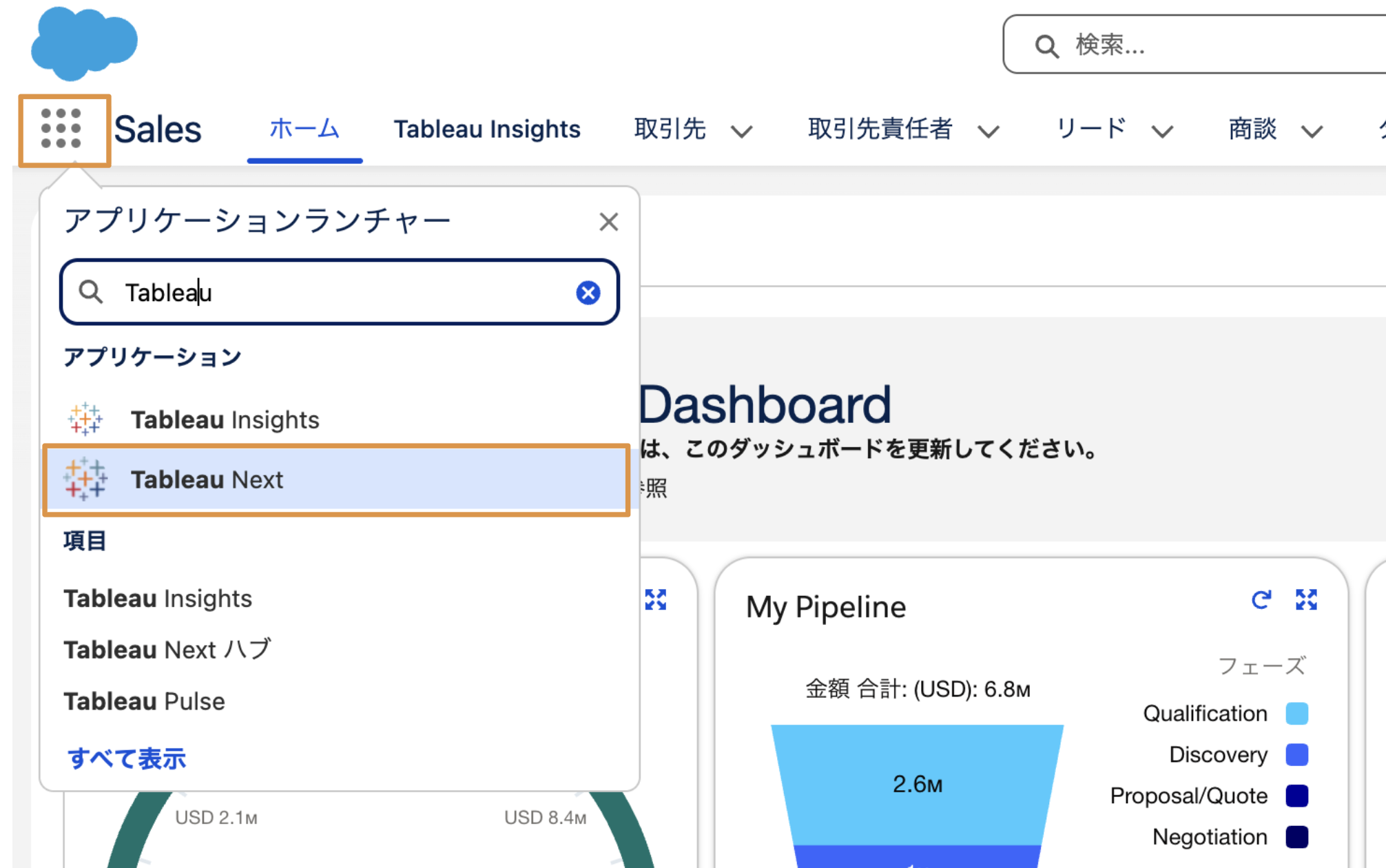 - Salesforceの左上の[ アプリケーションランチャー]をクリックし、[Tableau Next]を選択します。