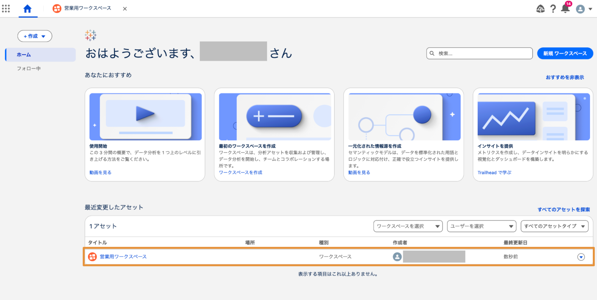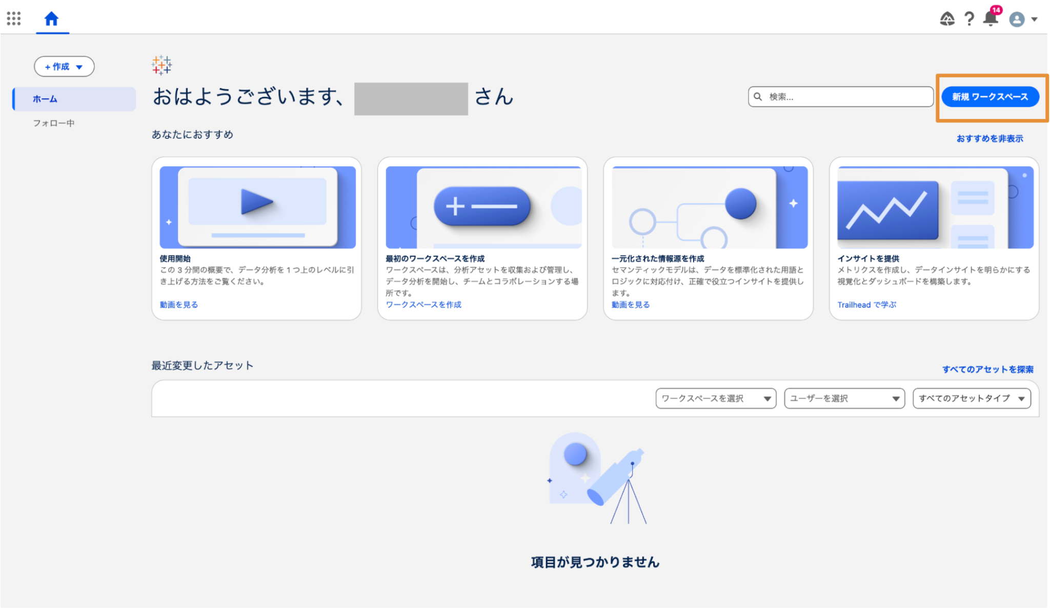 Tableau Nextでこれから作成方法をご紹介する分析アセットは、作成時にいずれかのワークスペースに属する必要があります。そのため、Tableau Next活用の最初のステップとしてはワークスペースを作成することとなります。