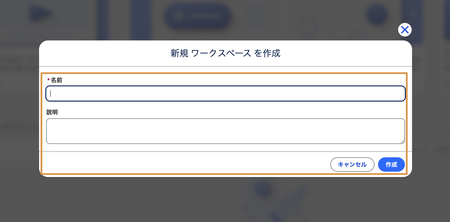 [名前]にワークスペース名を入力、必要に応じて[説明]に情報を入力し、[作成]をクリックします。