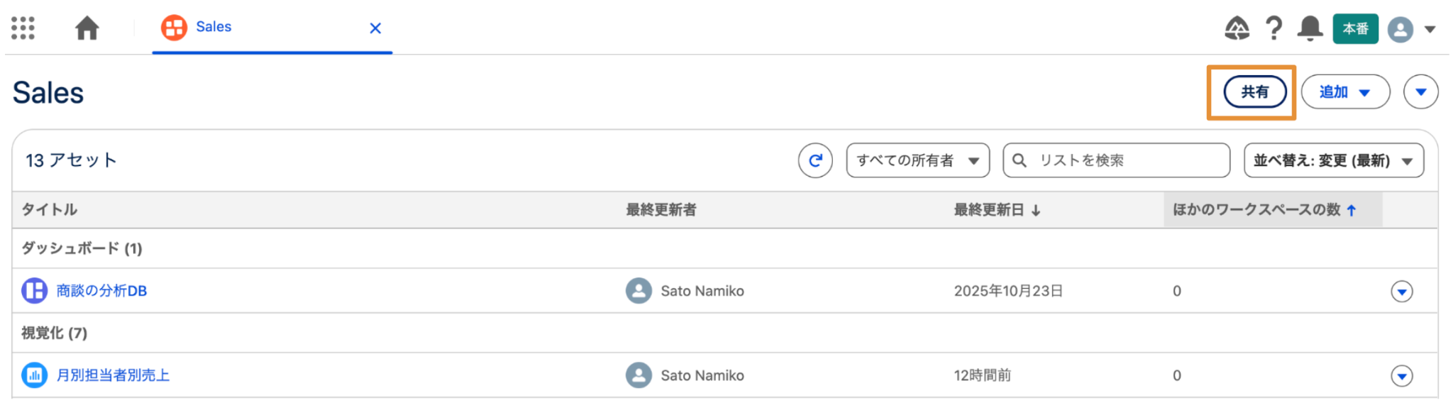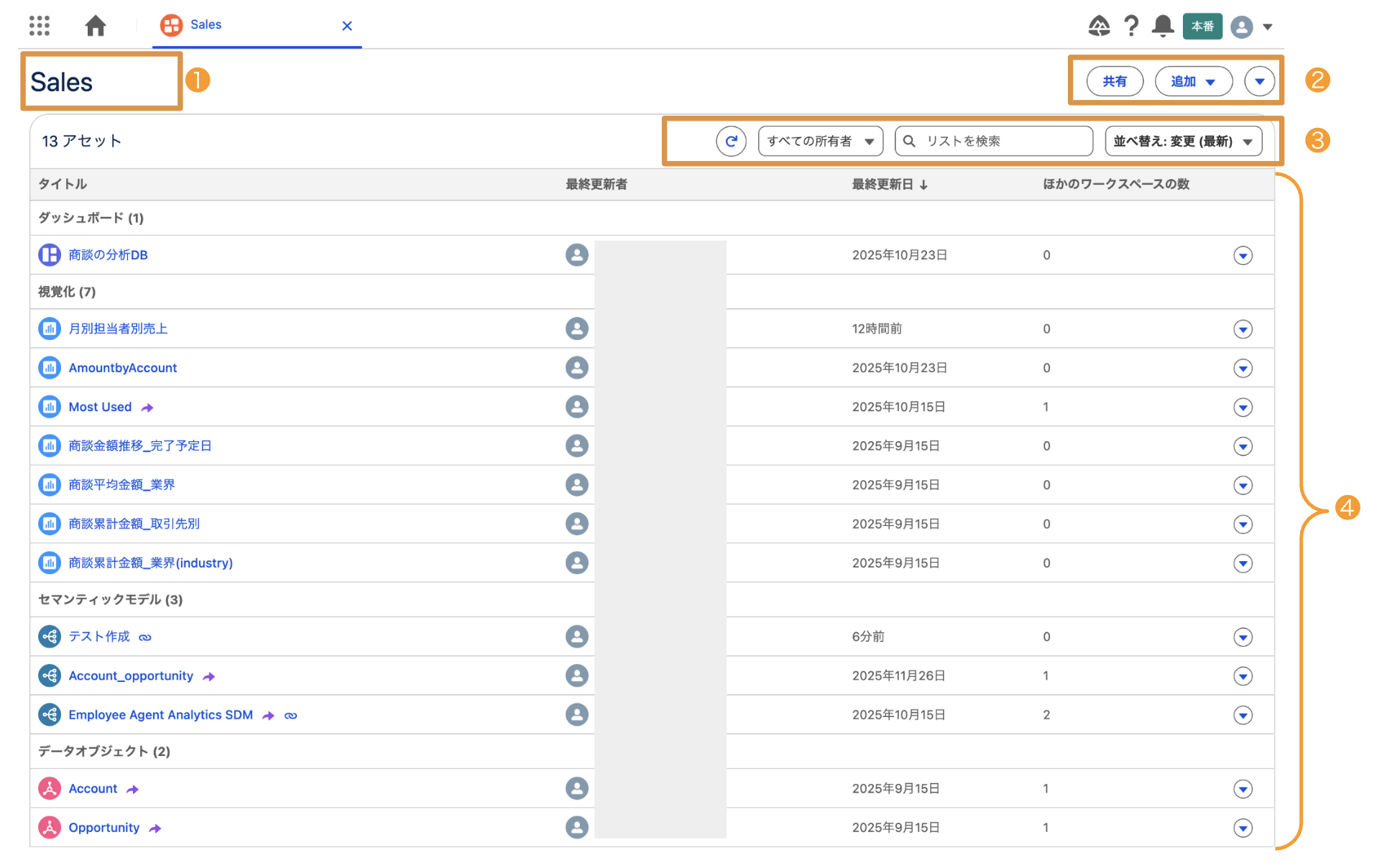 - ②:ワークスペースの共有設定や、ワークスペースへの分析アセットの追加、ワークスペースの編集、削除などがこのエリアのボタンから可能です。