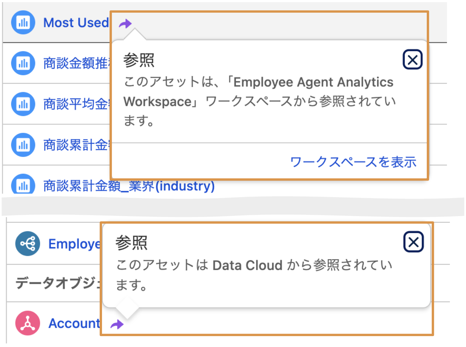 ワークスペースにアセットを追加する方法は作成だけではありません。他のワークスペースやData 360(旧Data Cloud)からアセットを参照追加することができます。現在表示しているワークスペースに参照追加されたアセットにはこのアイコンがつきます。