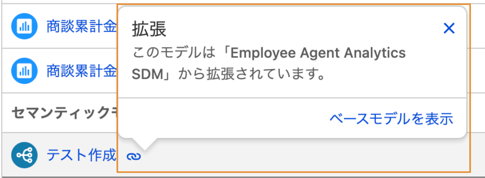 セマンティックモデルを作成する時に、既存のセマンティックモデルを拡張して作成することができます。拡張して作成されている場合このアイコンがつきます。