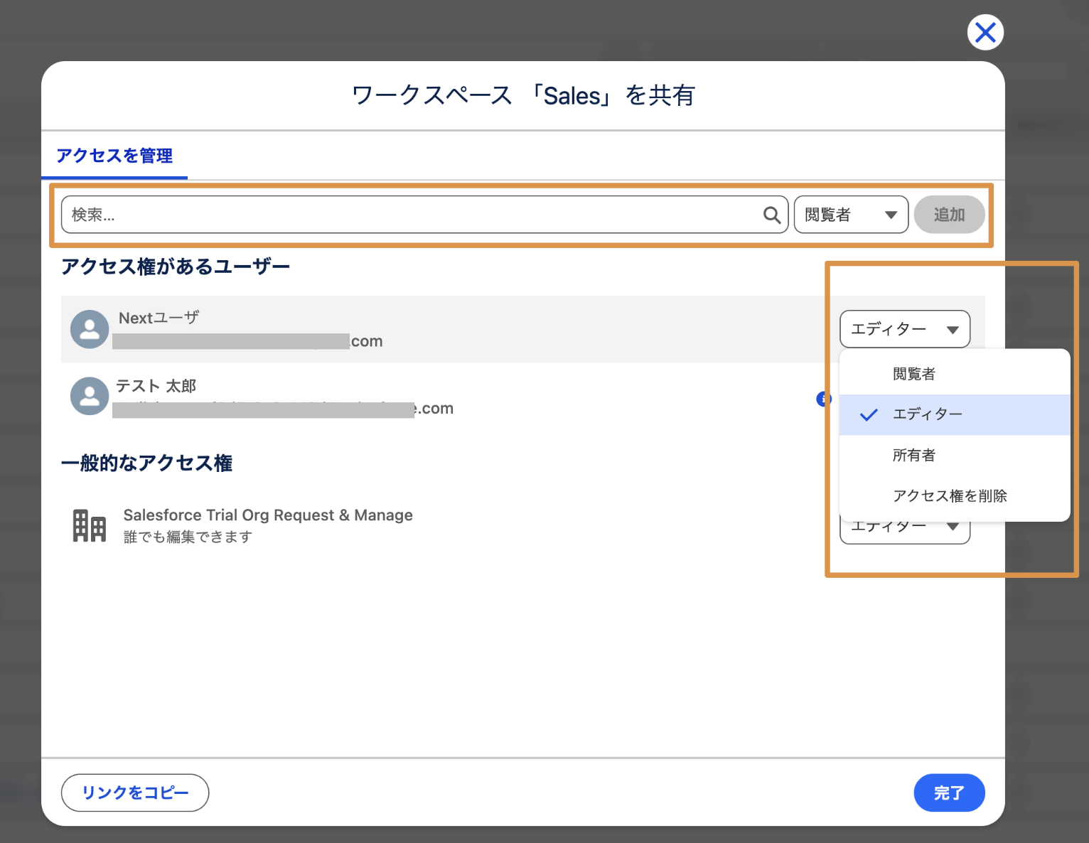 検索から共有対象を検索し、アクセス権を付与したり、既存のアクセス権の変更を行います。