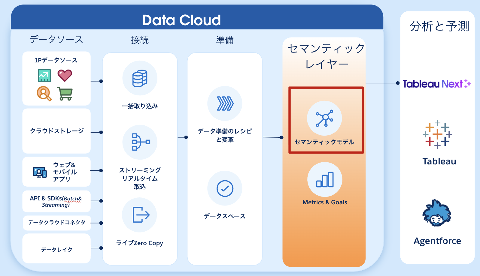 セマンティックモデルはセマンティックレイヤー内のコンテンツの1つであり、ともにData 360(旧Data Cloud)の機能です。Data 360においては、それぞれ以下のように位置づけられます。