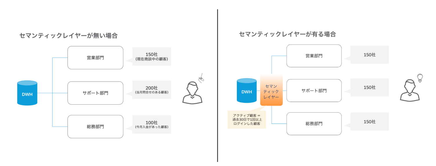 例えば従来の分析現場では、部門やツールごとに直接データウェアハウスに接続し、それぞれで「利益率」や「売上高」といったビジネス指標を計算するため、同じ計算を意図しても分析結果が異なる場合がありました。