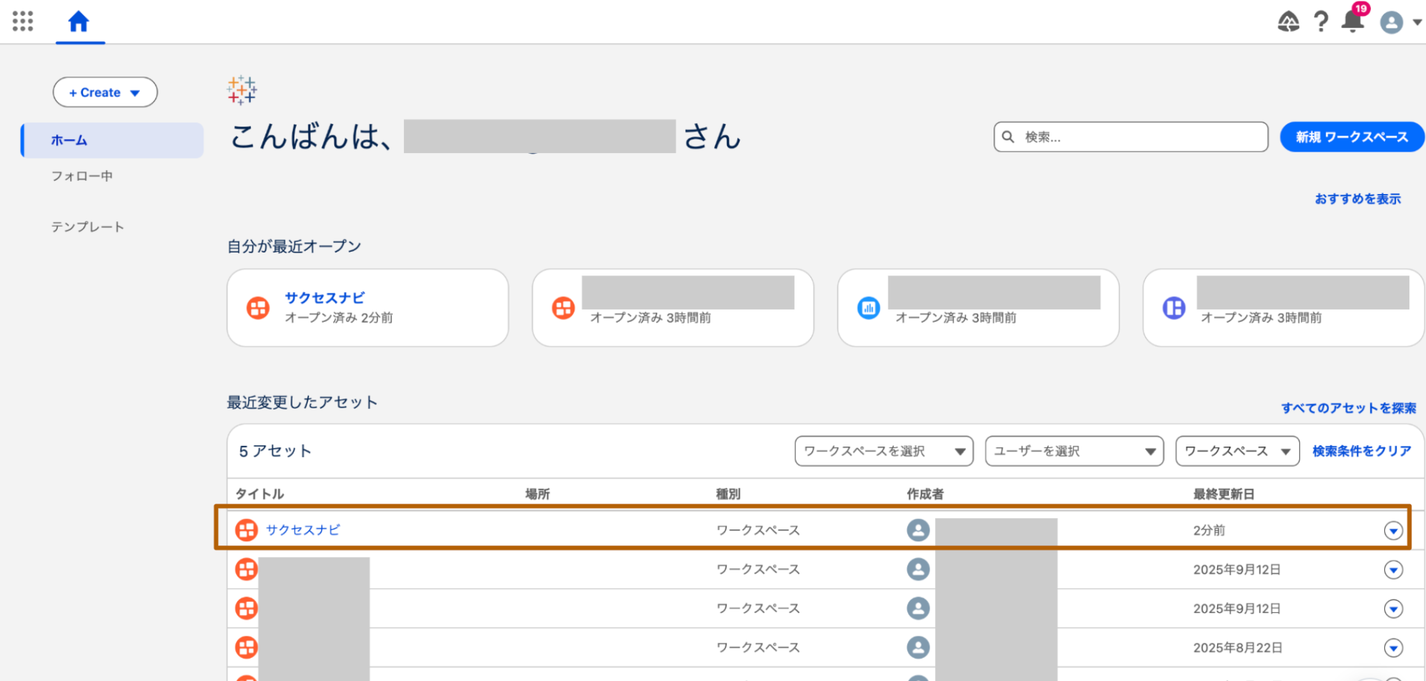 - TableauNextのホームから、作業を行うワークスペースをクリックします。