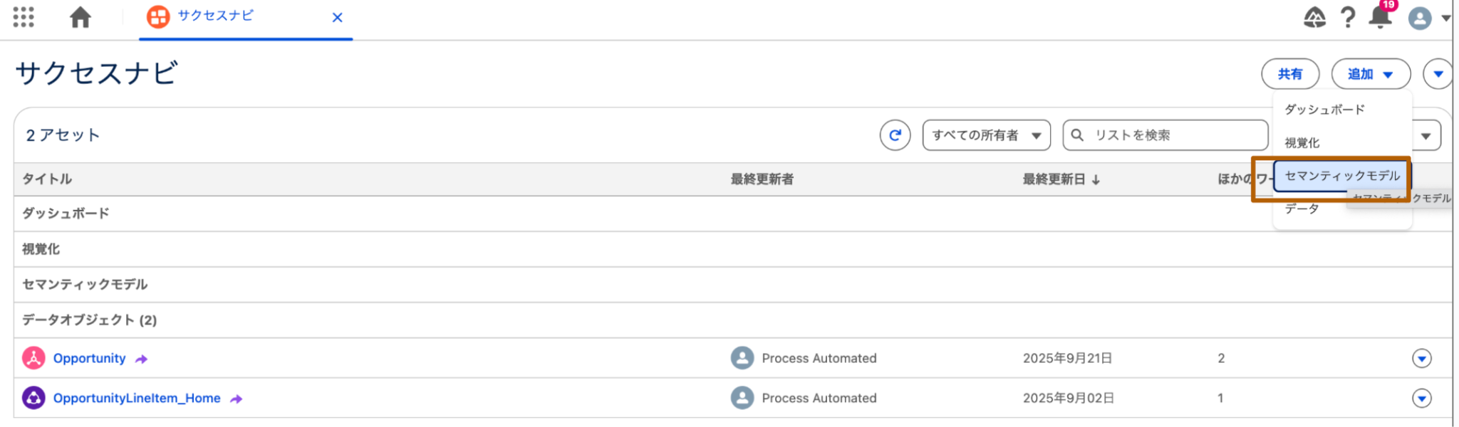 - 遷移後の画面にて、画面右上[追加▼]>[セマンティックモデル]をクリックします。
