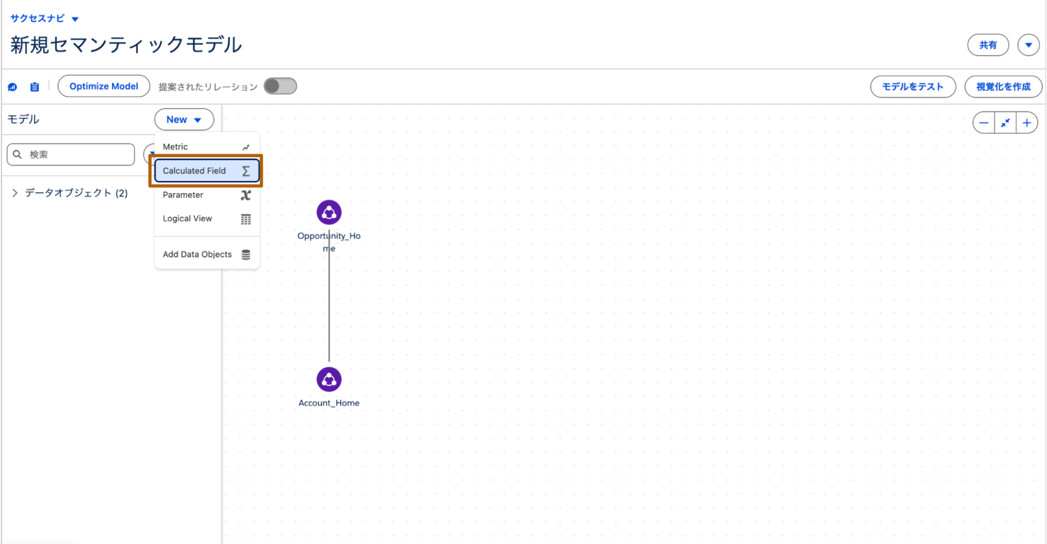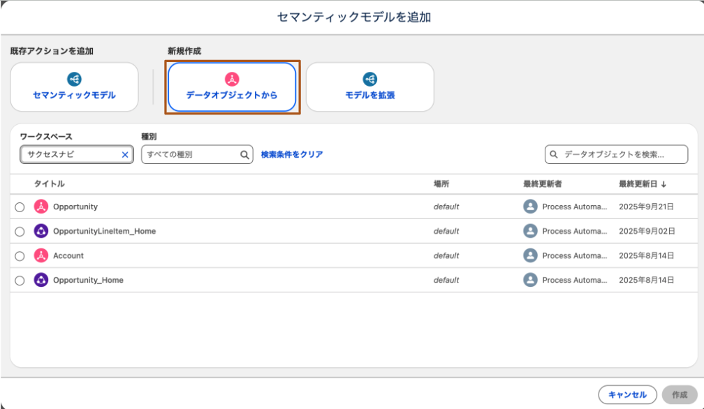 ※セマンティックモデルを作成する方法としては、データオブジェクトから新規に作成する方法と、既存セマンティックモデルを拡張して作成する方法の2パターンあります。本記事内では新規に作成する方法をご案内していますが、既存のセマンティックモデル拡張についてはHelp:既存のモデルに基づくセマンティックモデルの作成を確認ください。