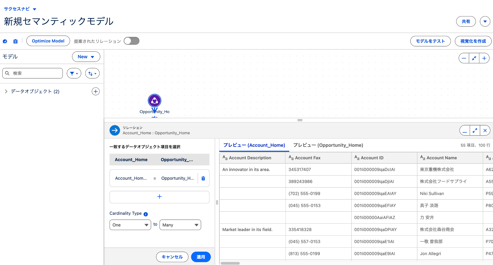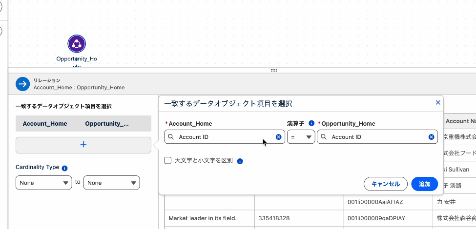 - ドラッグ&ドロップで線をつなげ、関係性を定義します。線をつなぐとリレーションを定義する画面が表示されます。