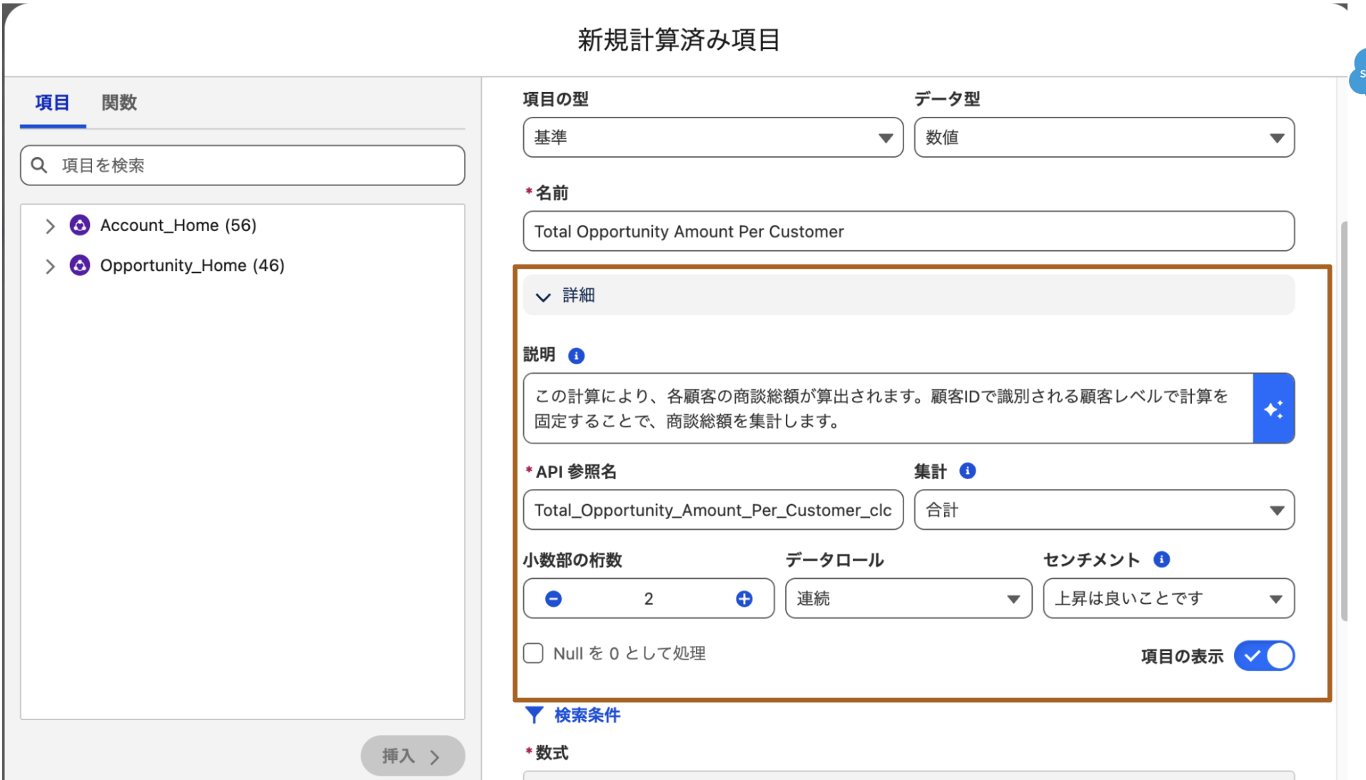 - 最後に[保存]をクリックします。新規の計算済み項目が作成されました。