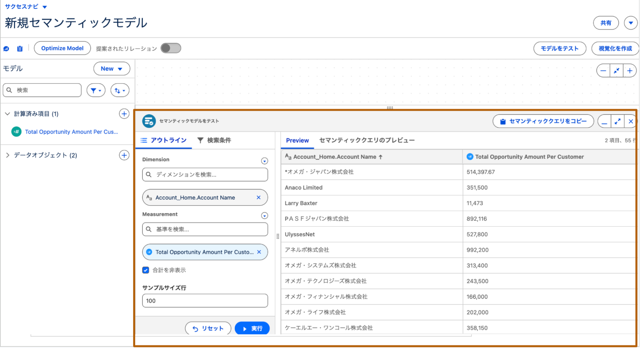- ディメンション/メジャー、検索条件をそれぞれ指定し、当該セマンティックモデルを利用した場合、どのような値が返されるかを事前に確認することができます。