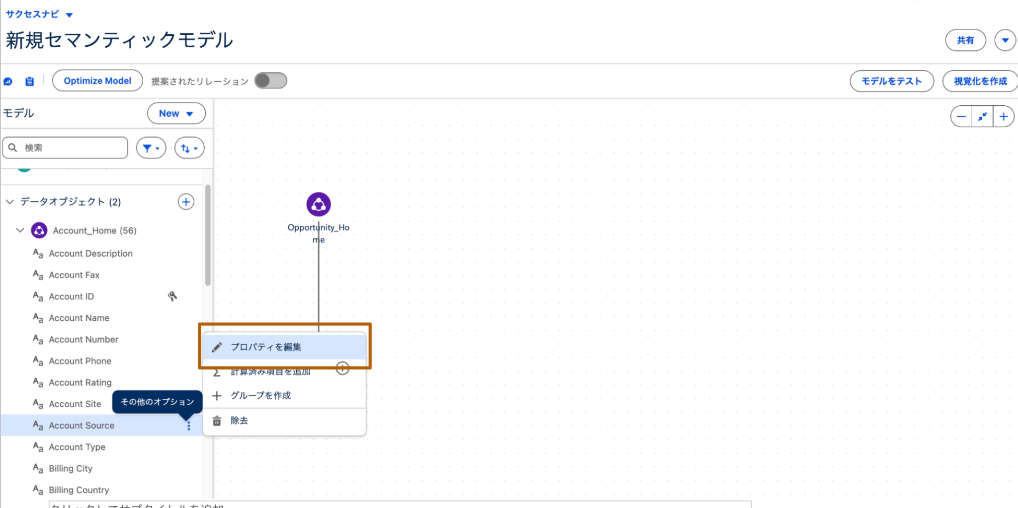 - セマンティックモデルビルダー上でプロパティを変更したいデータオブジェクトの[その他のオプション]>[プロパティを編集]をクリックします。