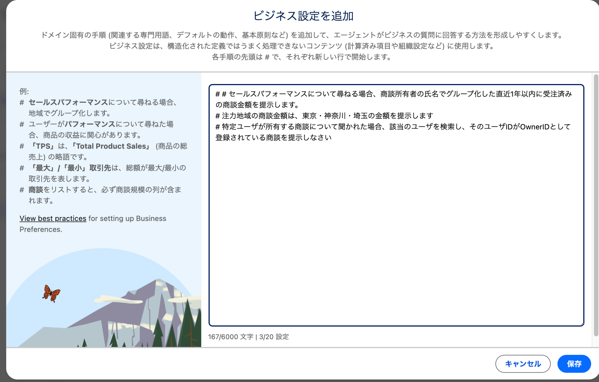 特に、エージェントの分析強化においてはビジネス設定は重要です。関連する専門用語、デフォルトの動作、ガイド原則など、エージェントに対する指示を含めることができます。