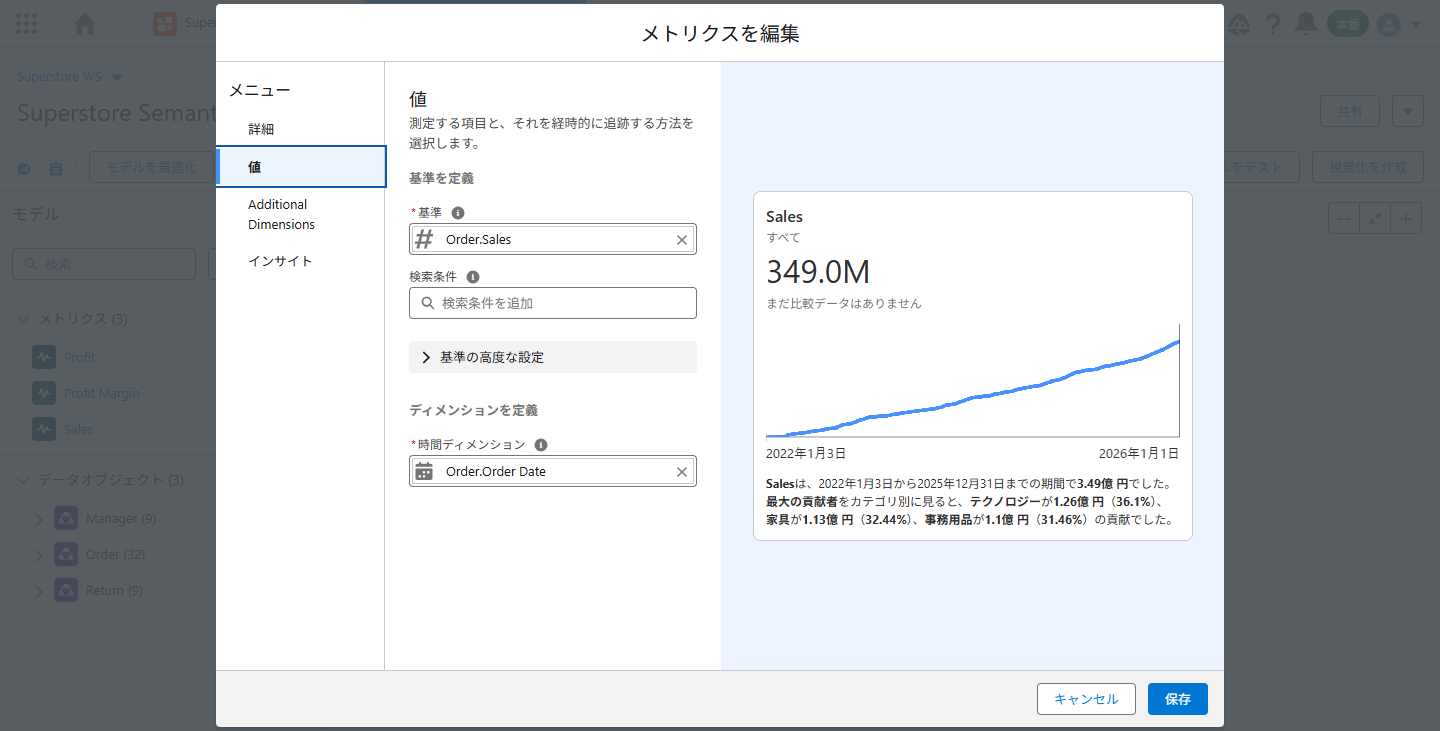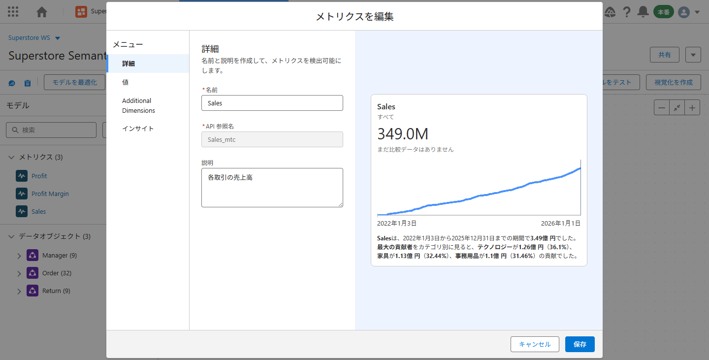 - 詳細:メトリクスの名前と説明を設定します(説明は省略可能ですが、AIにビジネスコンテキストを与え、質問の精度改善に寄与します)