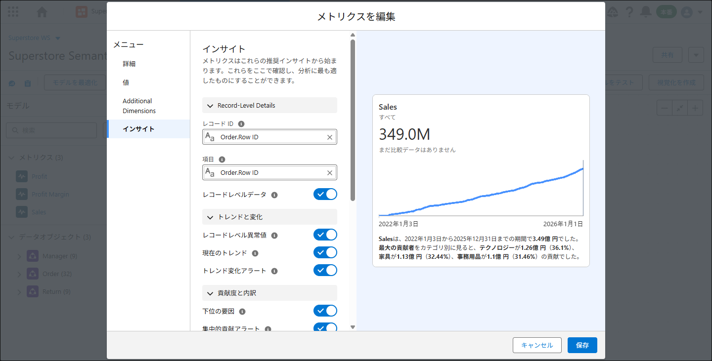 - インサイト:インサイトの種類を追加します。トレンドと変化、貢献度のカテゴリの中で表示するものと表示しないものを任意に指定できます。