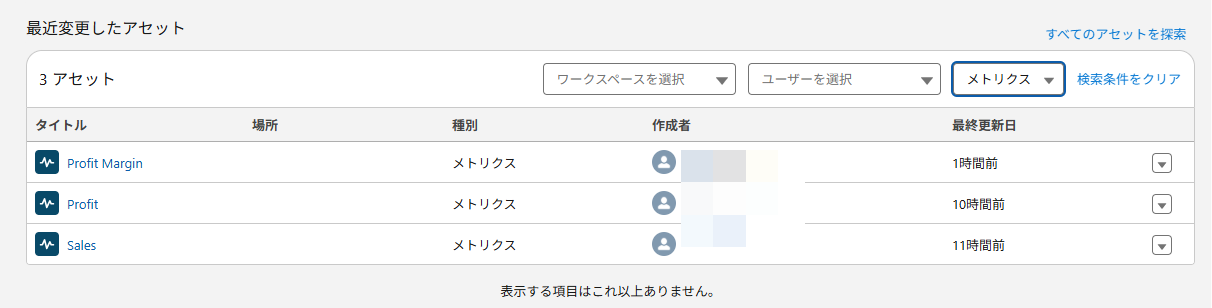 作成したメトリクスは、Tableau Next のホームページで一覧表示されます。探索したいメトリクスをクリックすると、メトリクスの表示画面に遷移します。