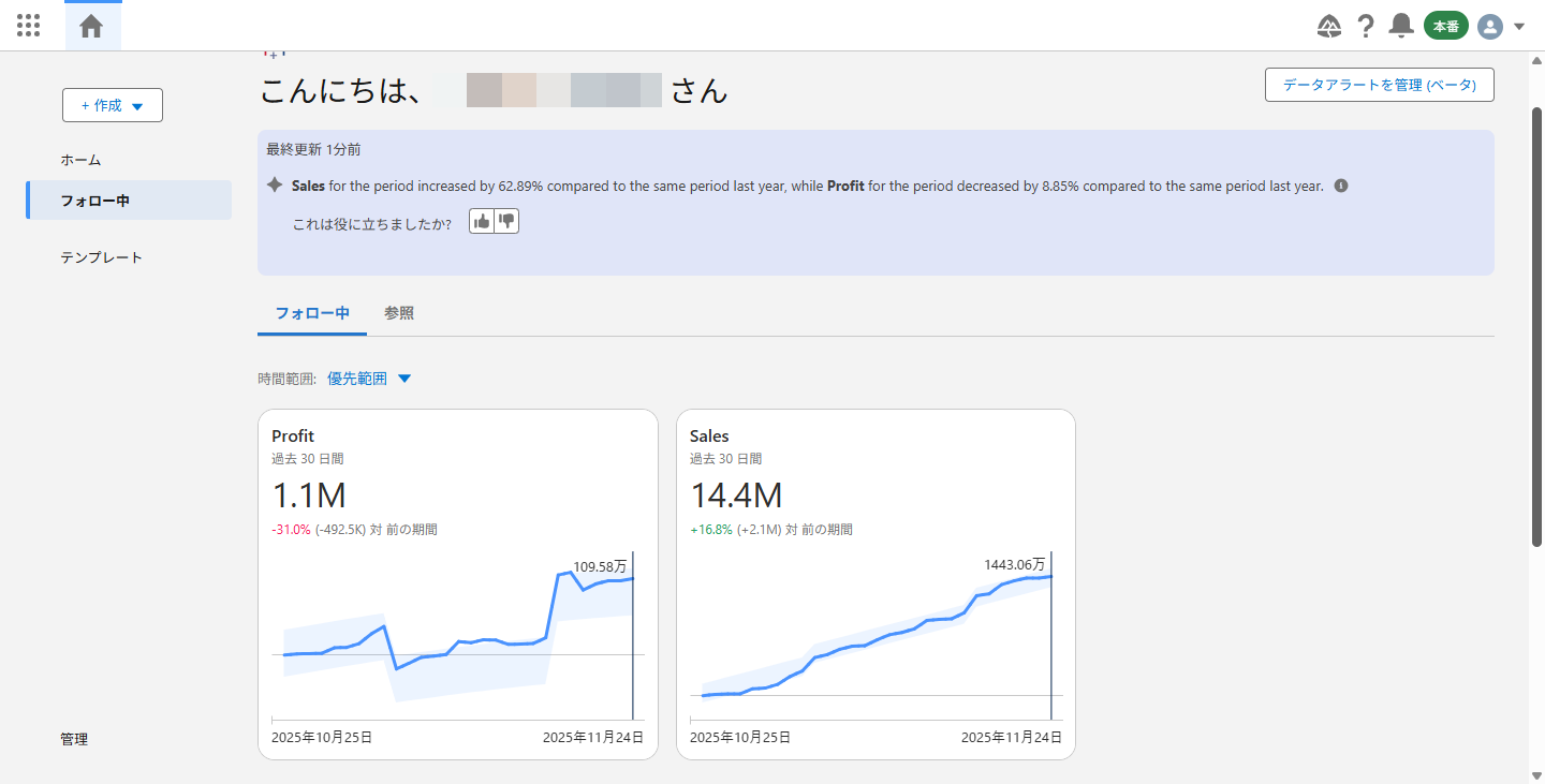 メトリクスをフォローする(画面右上の [フォロー] ボタンをクリック)と、定期的に確認する必要がある重要な指標を、Tableau Next のホームページでまとめて確認できるようになります。