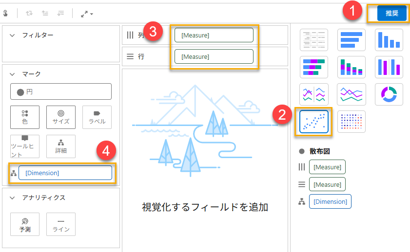 - チャートタイプのアイコンをクリックすると、そのチャート作成に必要なフィールドのガイドが現れます。